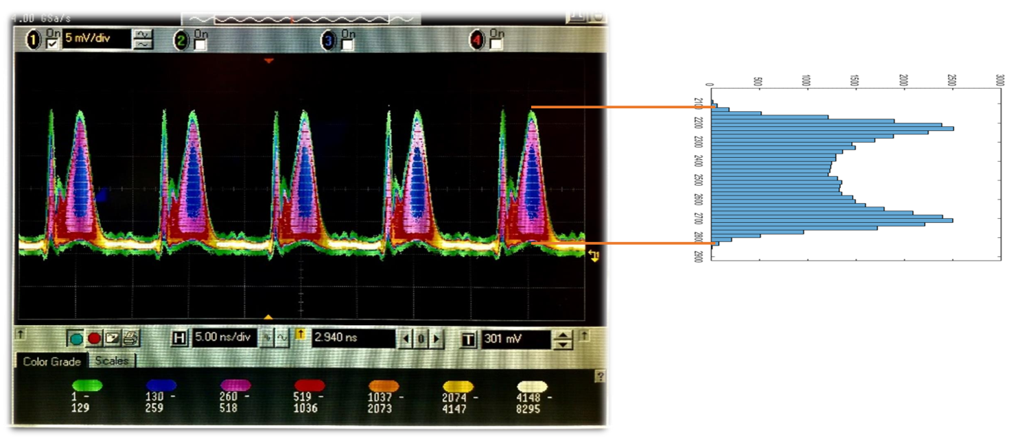 As we explained earlier, the phase 𝜃i is a quantum random variable with a Gaussian distribution. Therefore, the difference of two random variables with these characteristics is also a Gaussian random variable, whose cosine is a random variable with an arcsine distribution function. Since the rest of the parameters in the output power change more slowly than the phase changes or are constant compared to it, the output power is a quantum random variable with an arcsine distribution function. Figure 2 shows the output pulse of the optical receiver on the oscilloscope and the histogram of its size in the indicated interval, which is proportional to the output power of the interferometer, in the desired system. As you can see, the output power has an arcsine distribution function.